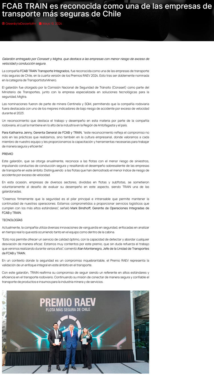 FCAB TRAIN es reconocida como una de las empresas de transporte más seguras de Chile - (elreferente.cl)