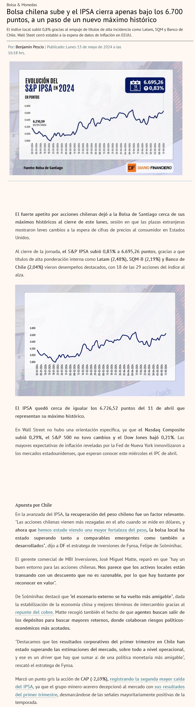 IPSA cierra cerca de los 6.700 puntos, a pasos de un nuevo máximo histórico - (Diario Financiero)