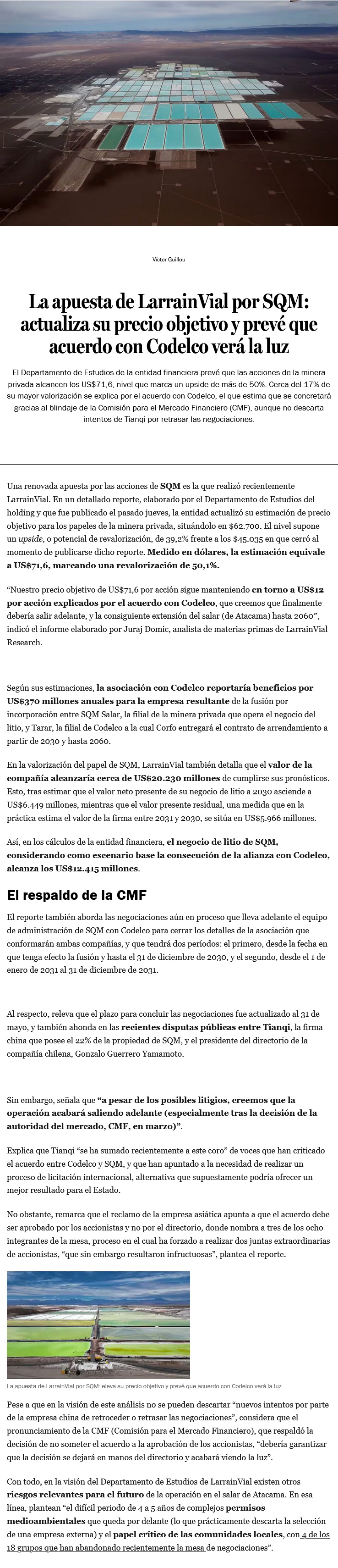 La apuesta de LarrainVial por SQM: eleva su precio objetivo y prevé que acuerdo con Codelco verá la luz - (redimin)