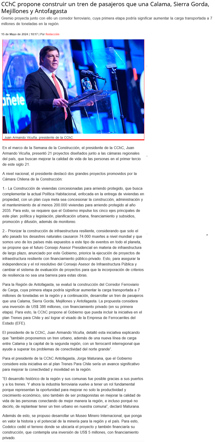 CChC propone tren de pasajeros para unir Calama, Sierra Gorda, Mejillones y Antofagasta - (El Mercurio de Antofagasta)