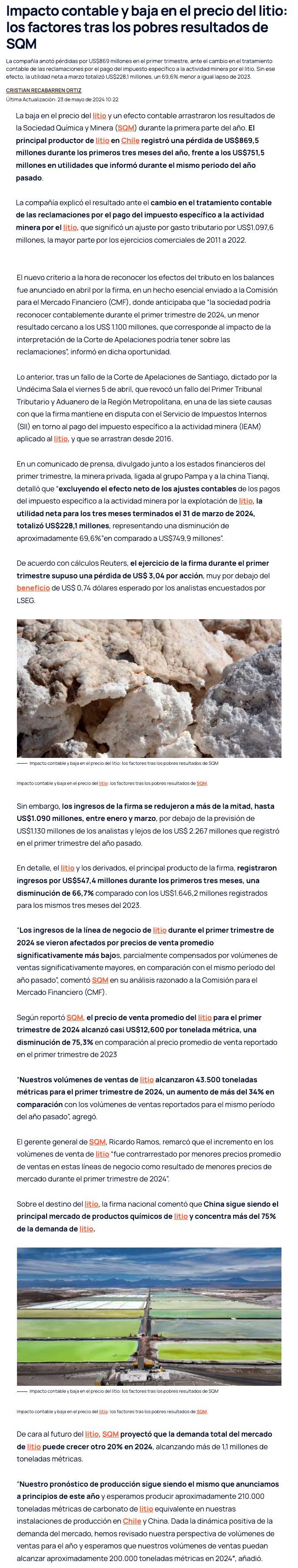 SQM registra pérdidas en el primer trimestre por caída de precios y ajuste tributario - (bloomberglinea.com)