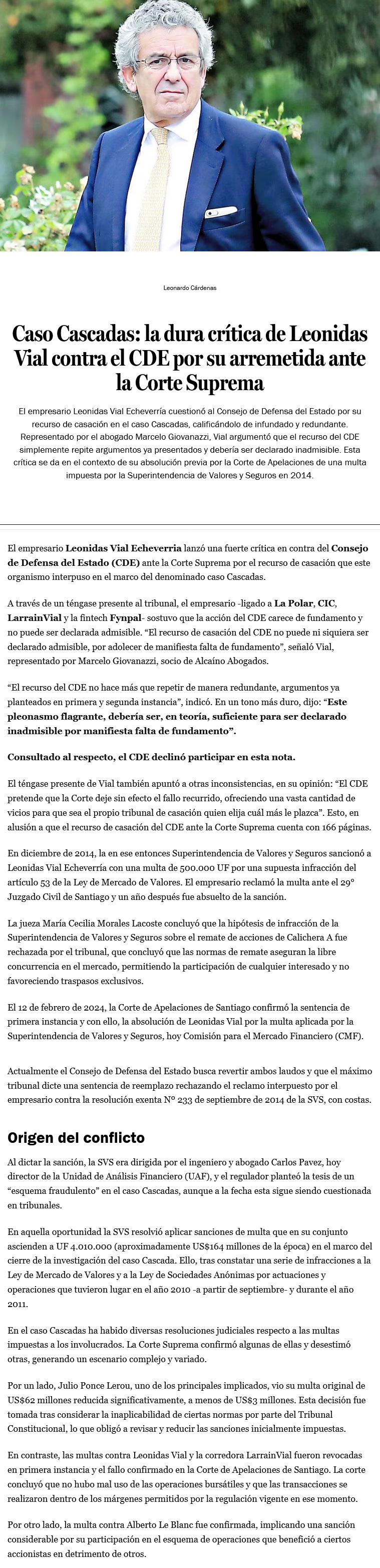 Caso Cascadas: la dura crítica de Leonidas Vial contra el CDE por su arremetida ante la Corte Suprema - (Pulso)
