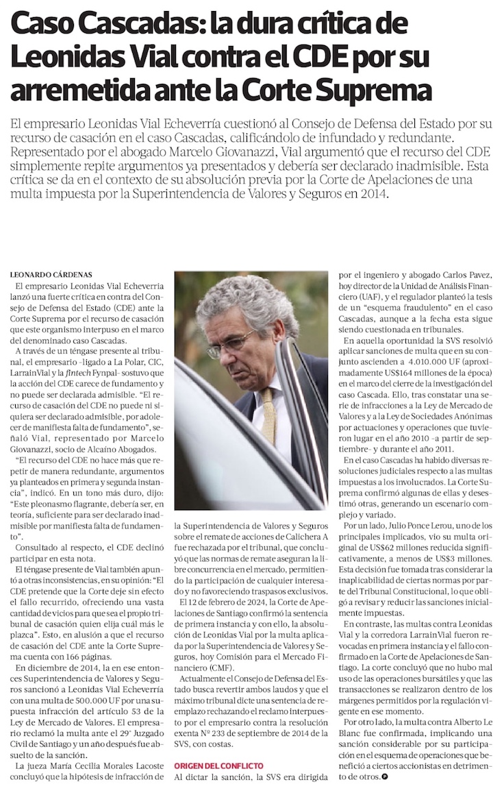 Caso Cascadas: la dura crítica de Leonidas Vial contra el CDE por su arremetida ante la Corte Suprema - (La Tercera Online)