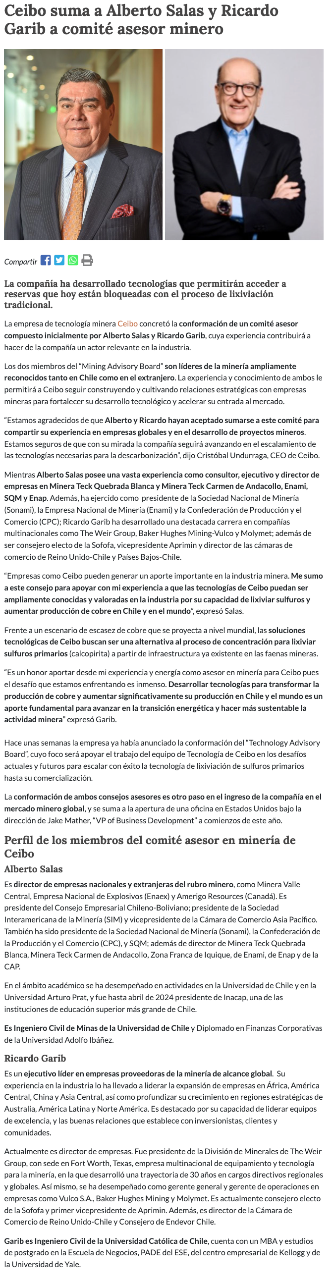 Startup minera Ceibo suma a ex presidente de SQM, Sonami y la CPC, Alberto Salas, a su comité asesor - (redimin)