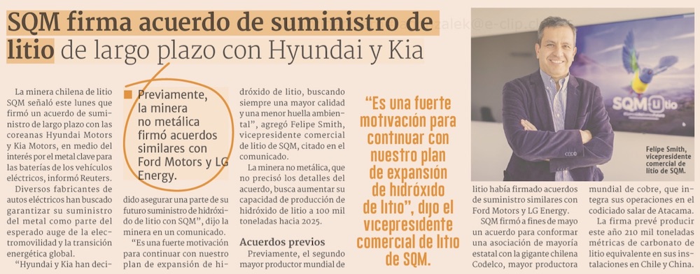 SQM establece acuerdos de largo plazo y firma contratos con Hyundai y KIA - (El Mercurio de Santiago)