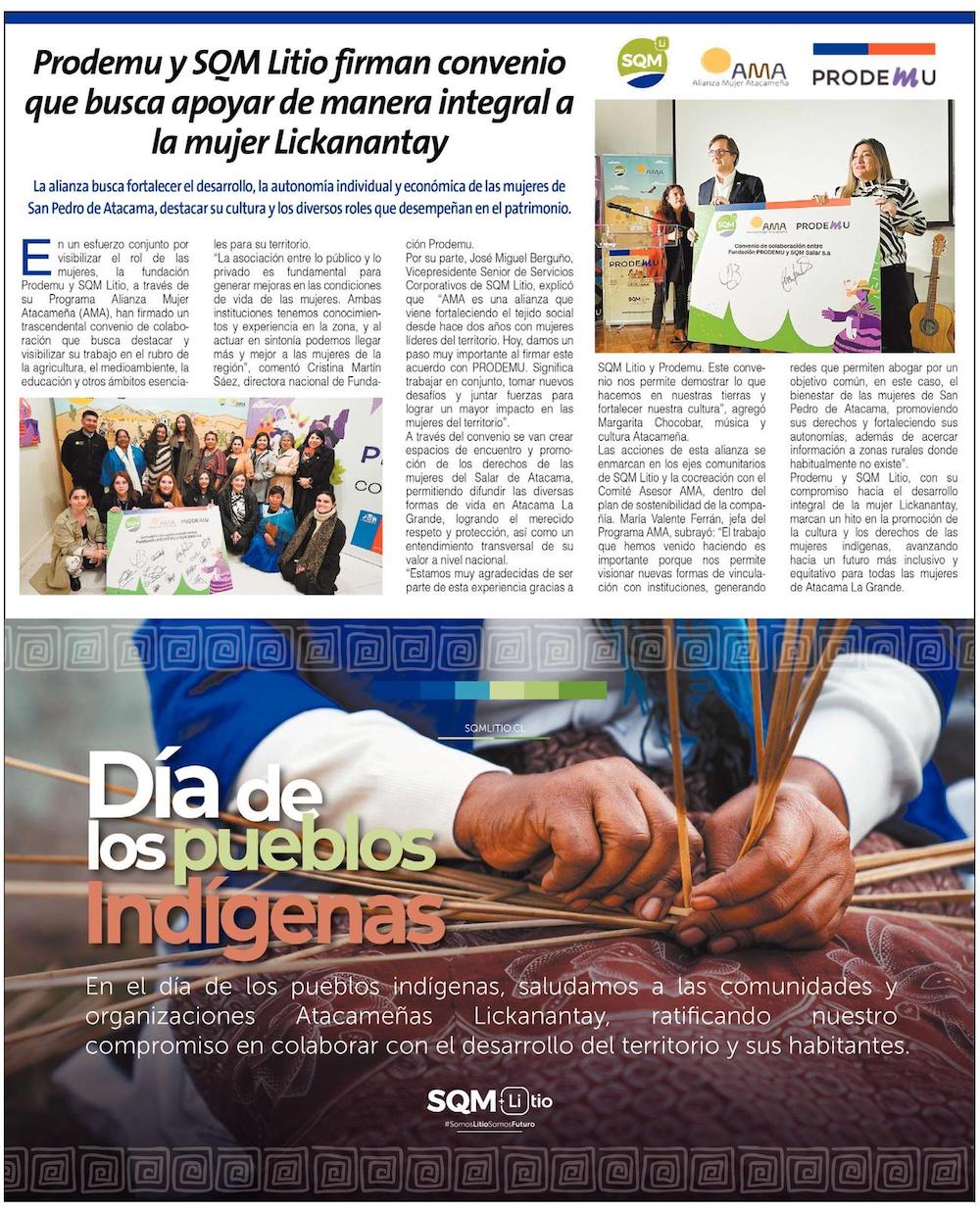 Prodemu y SQM Litio firman convenio que busca apoyar de manera integral a la mujer Lickanantay - (El Mercurio de Antofagasta)