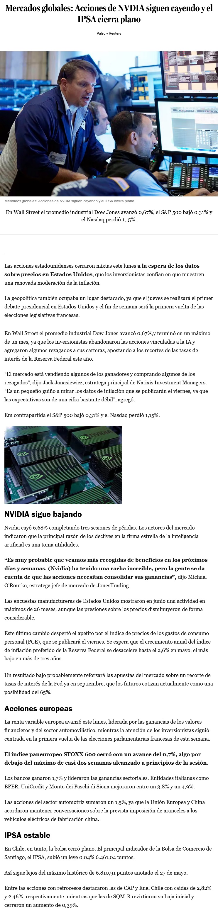 Mercados globales: Acciones de Nvidia siguen cayendo y el IPSA cierra plano - (Pulso)