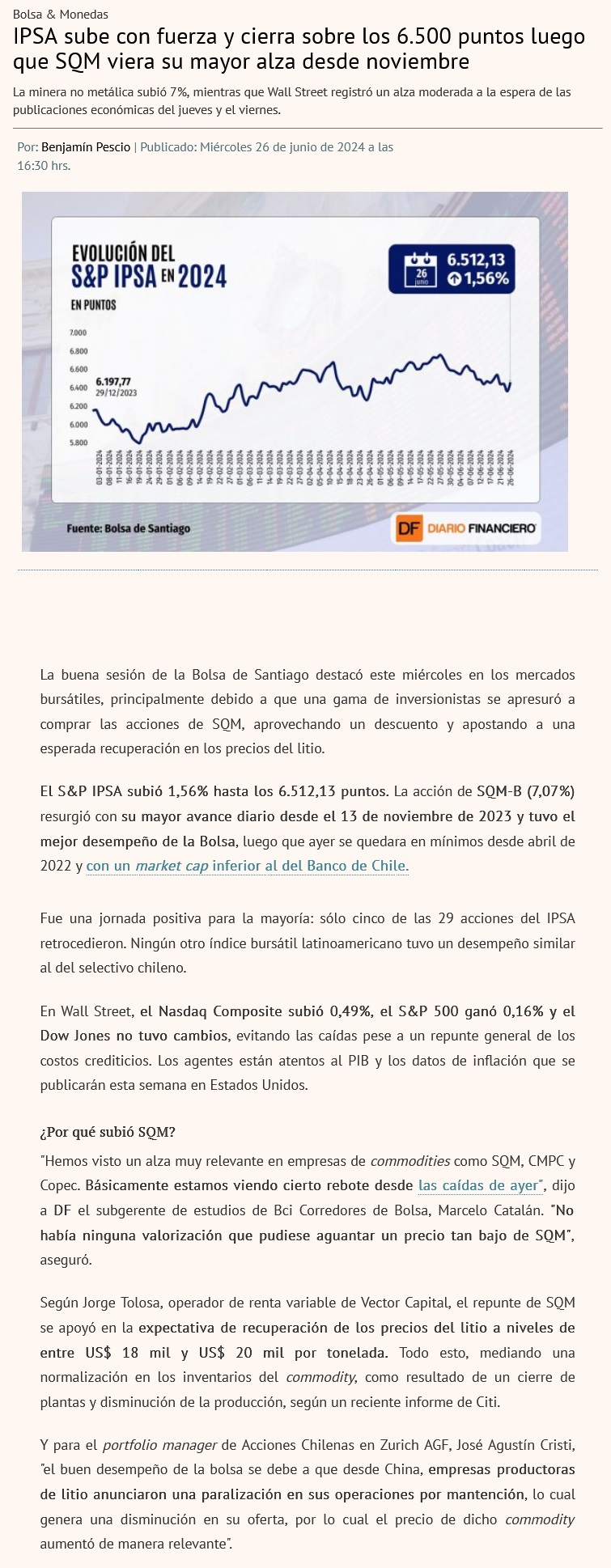 Wall Street repunta y el IPSA avanza con fuerza ante el impulso de SQM - (La Tercera Online)