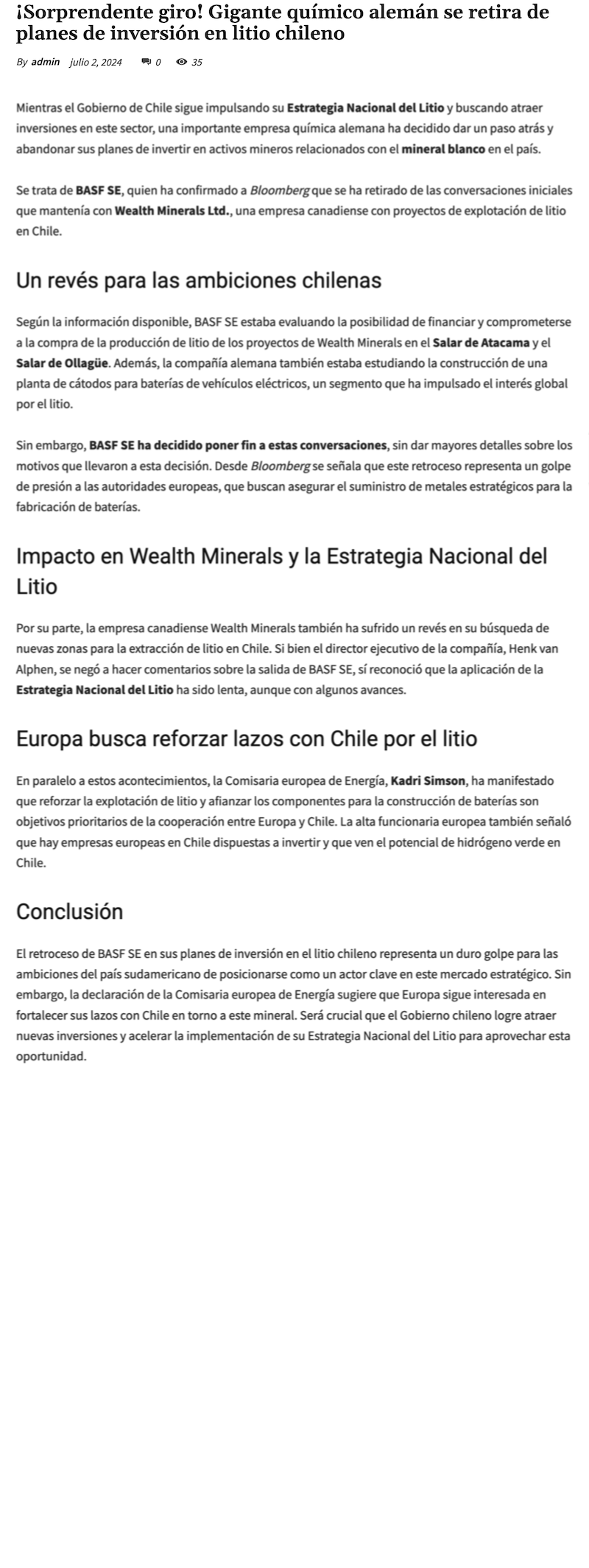 BASF abandona planes de inversión en litio en Chile - (redimin)