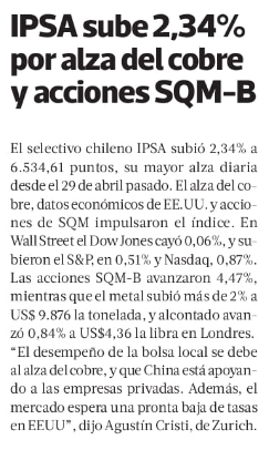 IPSA cierra con salto de más de 2%, su mayor alza diaria desde el 29 de abril, en una positiva jornada para bolsas globales - (DF Online)