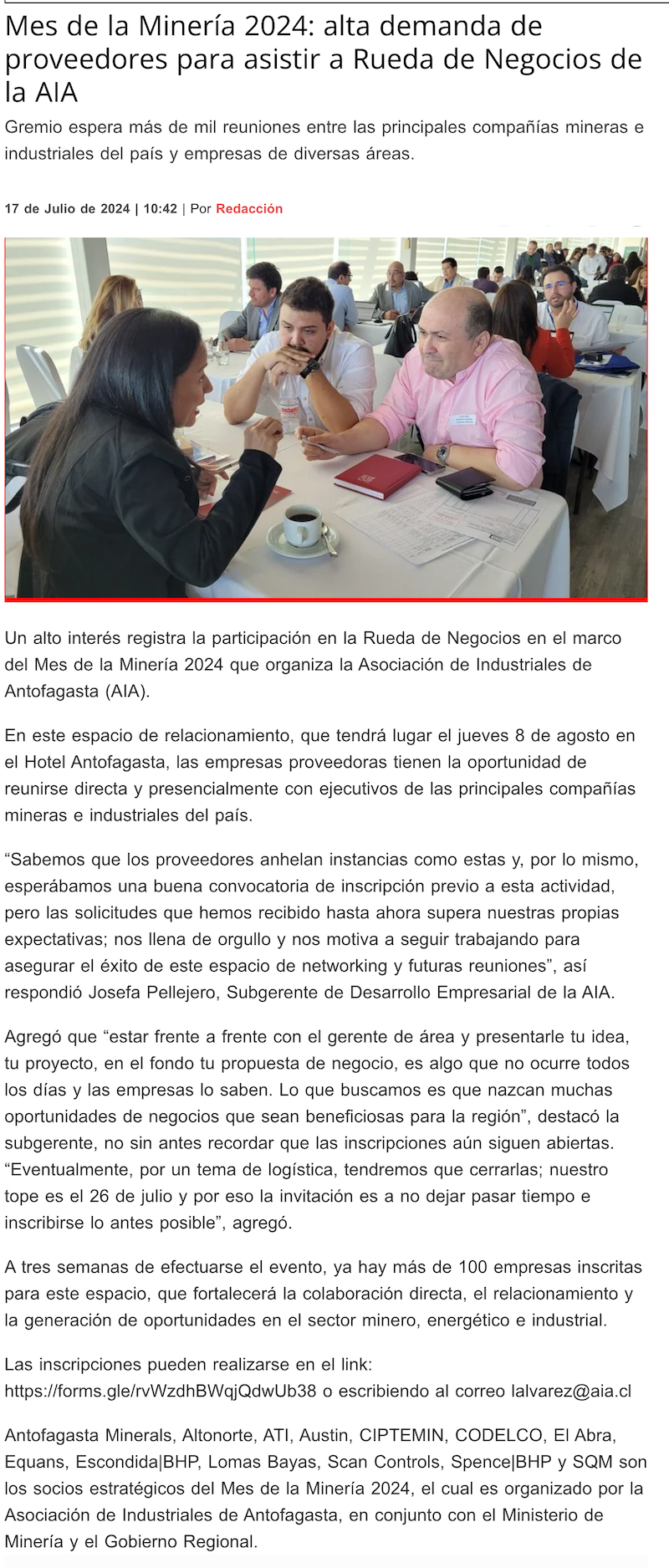 Mes de la Minería 2024: AIA resalta gran interés de proveedores por ser parte de la Rueda de Negocios - (mch.cl)