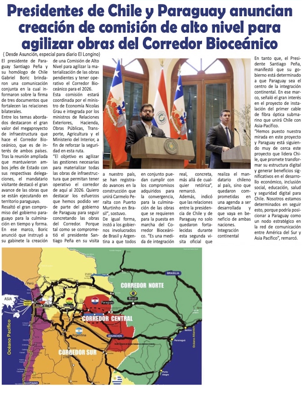 Gobierno compromete comisión de “alto nivel” para impulsar Corredor Bioceánico que une cuatro países - (El Mercurio de Santiago)
