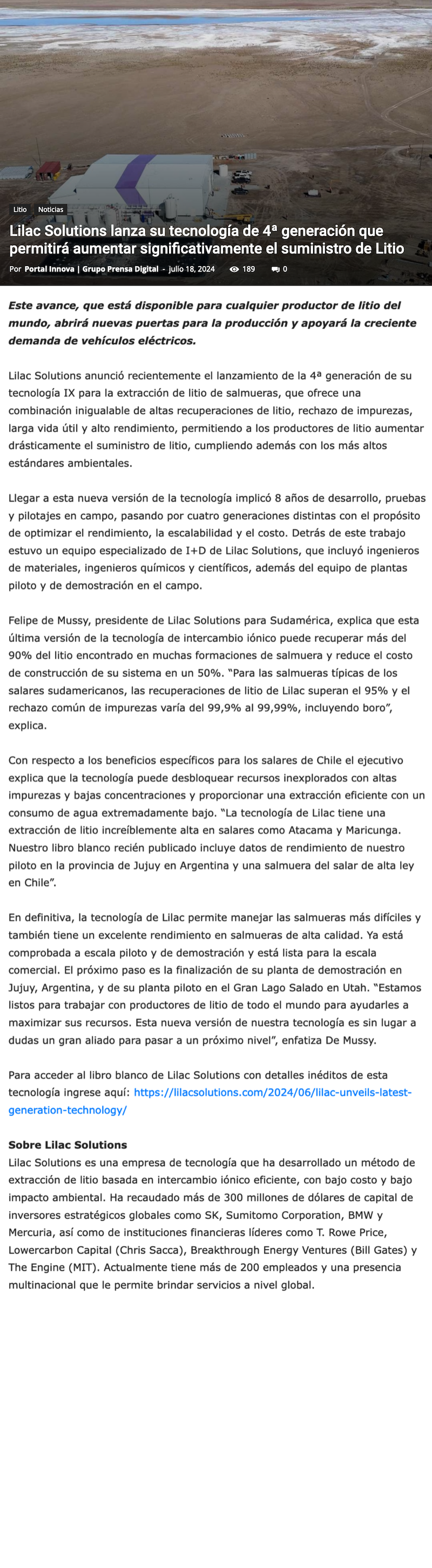 Lanzan tecnología que permite recuperar un 95% de litio contenido en las salmueras - (El Mercurio de Calama)