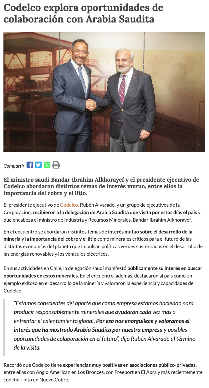 Codelco recibe a ministro de Industria y Recursos Minerales de Arabia Saudita y exploran oportunidades de colaboración - (mvcomunicaciones.cl)