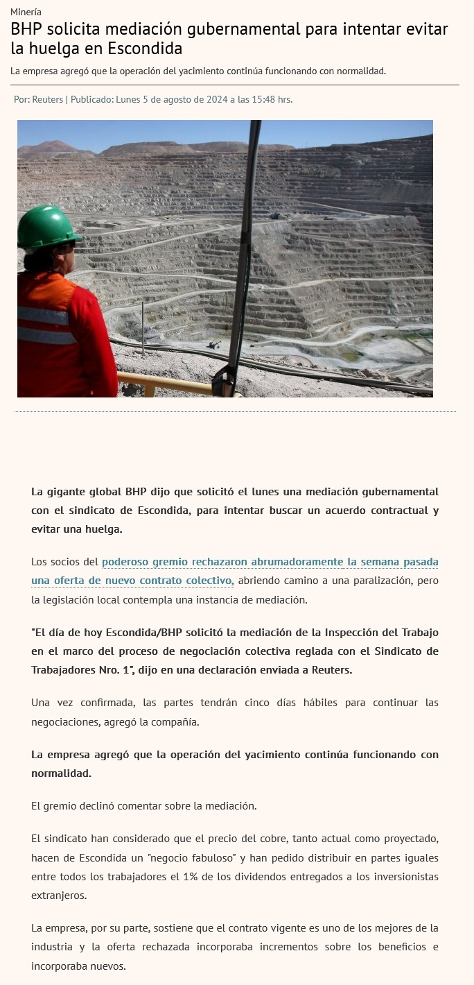 Escondida: BHP confirma petición de mediación - (Pulso)