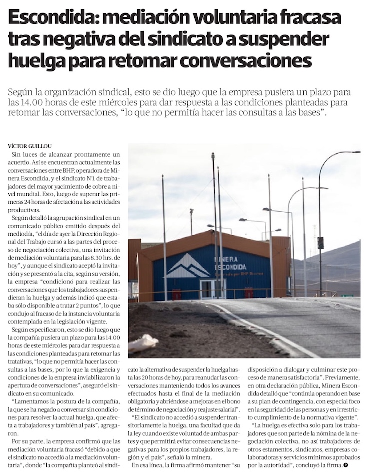 Quiebra nuevamente la mesa de negociación en Escondida y la DT evalúa nueva invitación - (El Mercurio de Antofagasta)