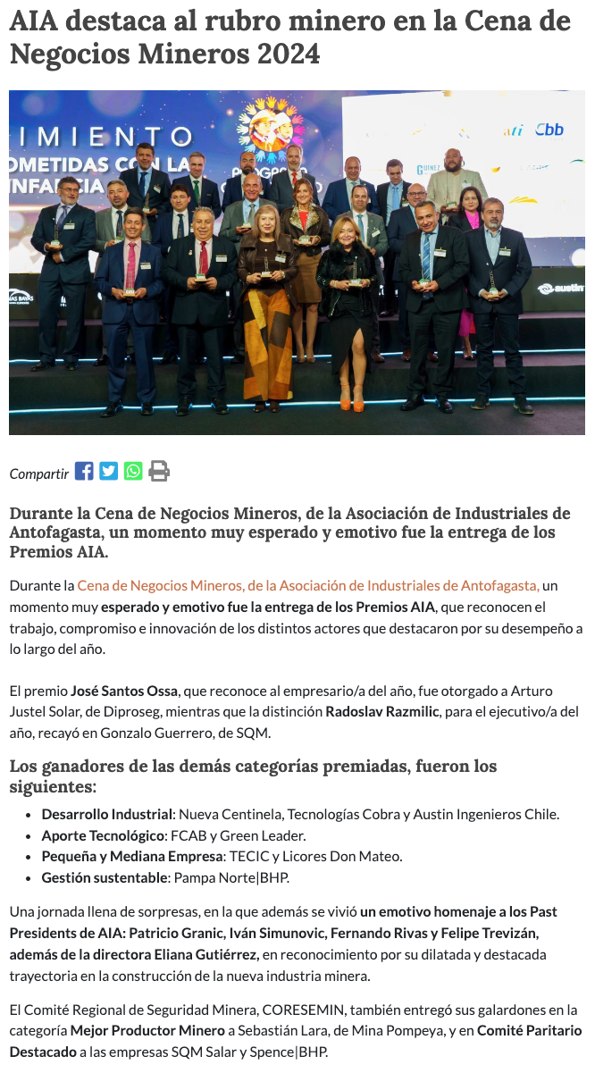 AIA destaca al rubro minero en la Cena de Negocios Mineros 2024 - (El Chañarcillo)