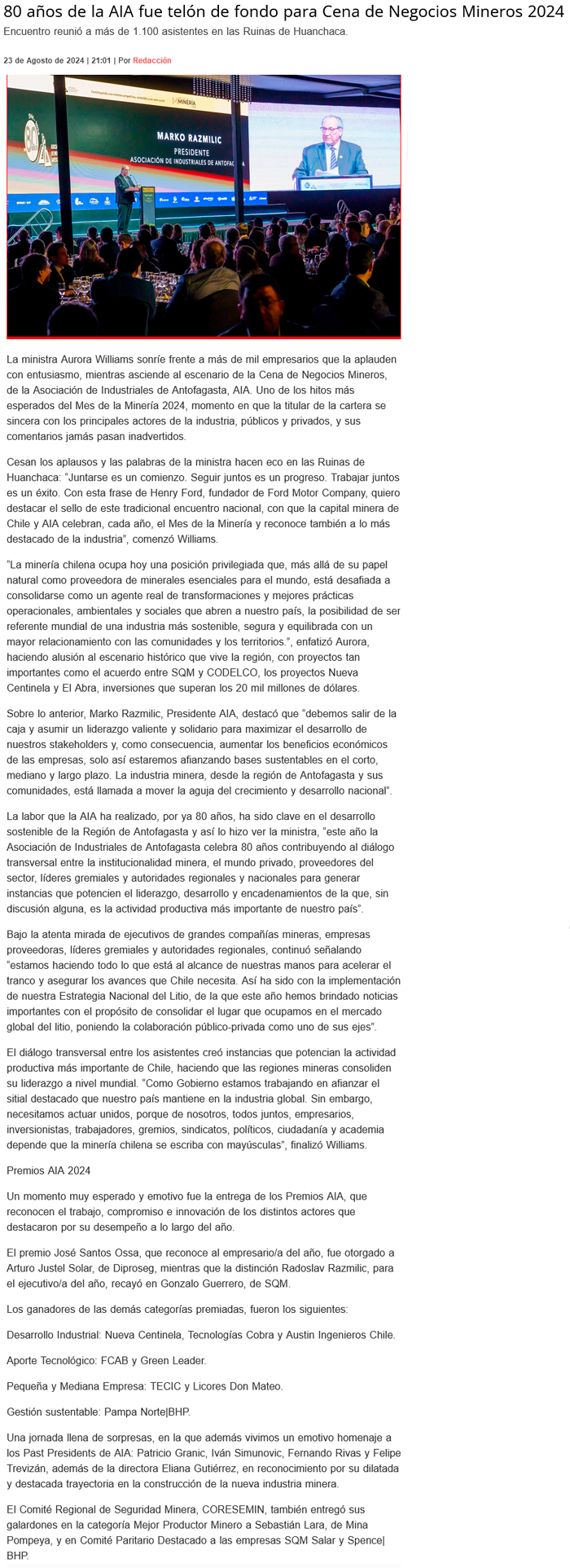 AIA destaca al rubro minero en la Cena de Negocios Mineros 2024 - (reporteminero)