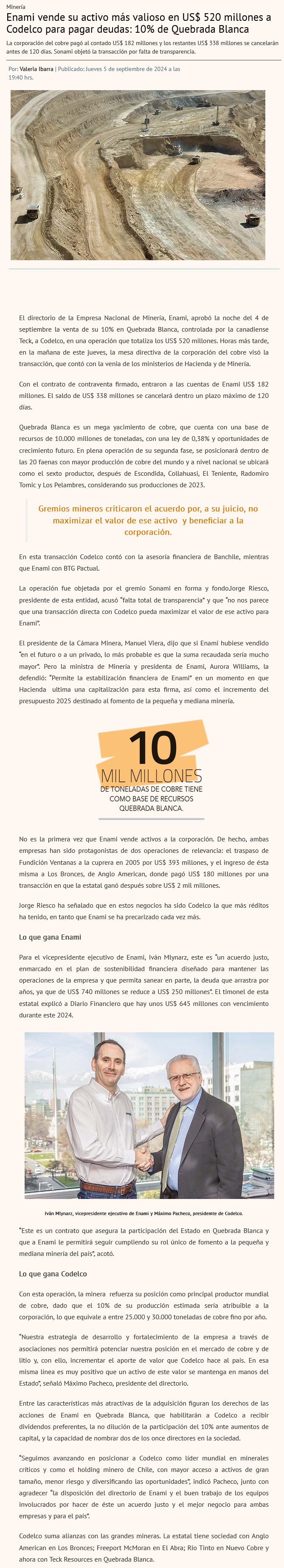 Enami vende 10% de Quebrada Blanca, su activo más valioso, en US$ 520 millones a Codelco para pagar deudas - (Diario Financiero)