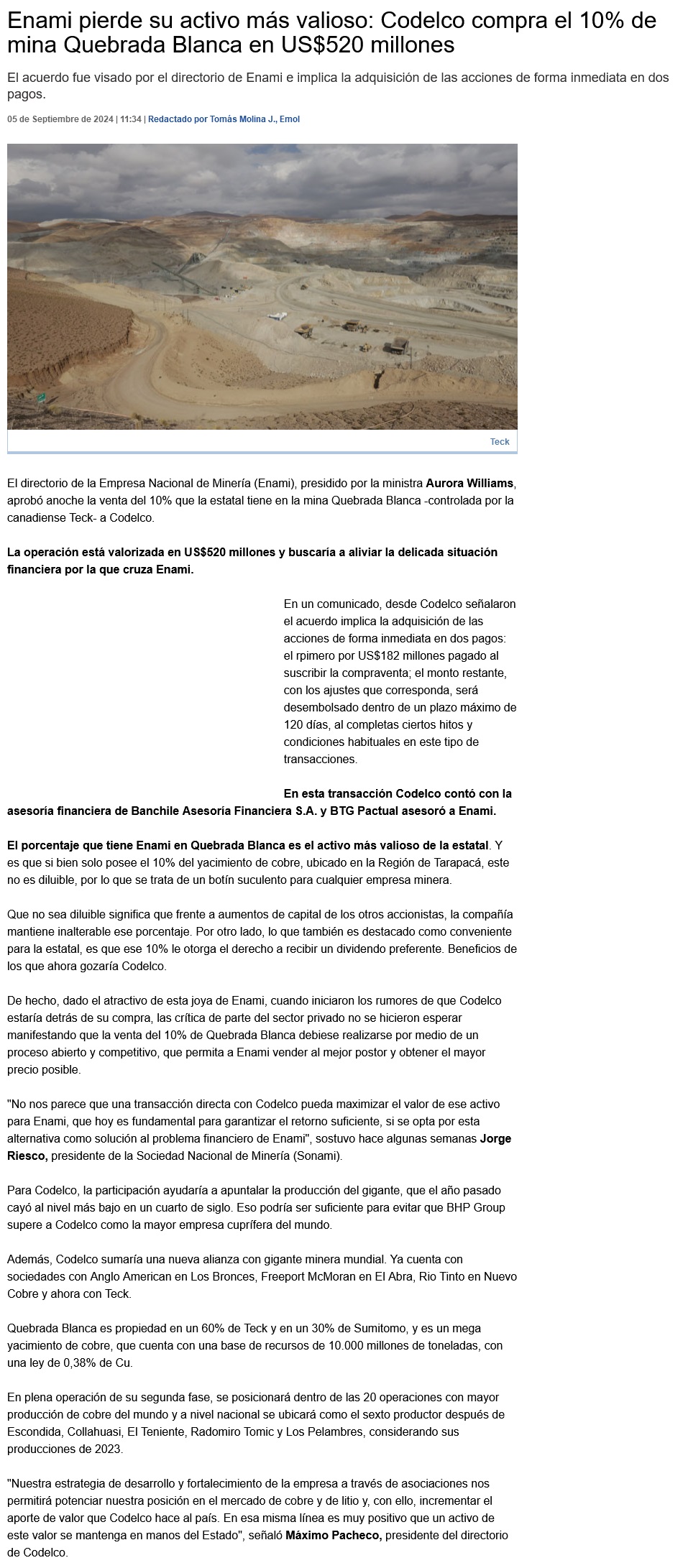 Enami vende 10% de Quebrada Blanca, su activo más valioso, en US$ 520 millones a Codelco para pagar deudas - (Diario Financiero)