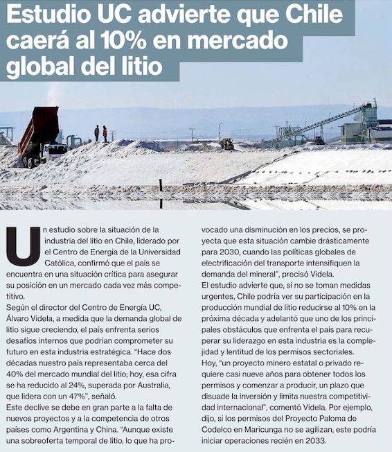 Advierten por caída de Chile en el mercado global del litio - (El Mercurio de Santiago)