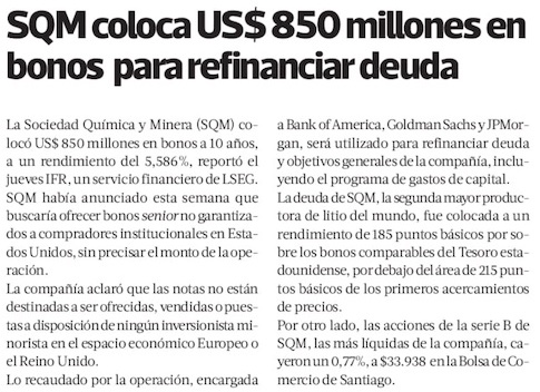 SQM coloca bonos a 10 años por US$ 850 millones para refinanciar deuda - (DF Online)