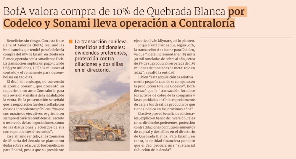 Sonami acude a Contraloría tras venta del 10% de Enami en Quebrada Blanca - (Pulso)