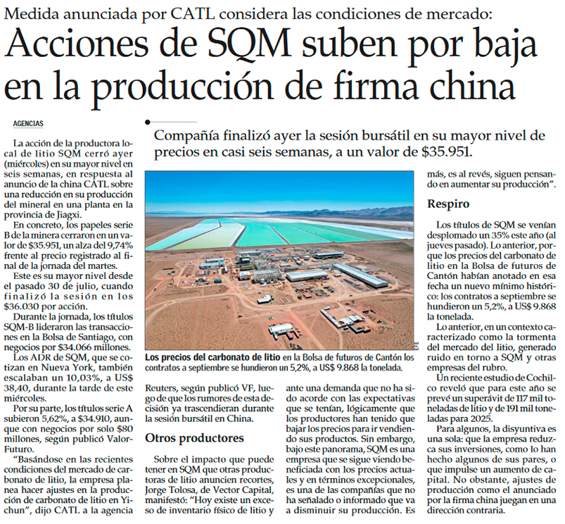 Acciones de SQM lideran alzas en la Bolsa de Santiago tras ajustes de productora china de litio - (biobiochile online)