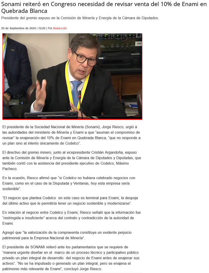 Enami y Codelco defienden en el Congreso el precio pagado por Quebrada Blanca - (Pulso)