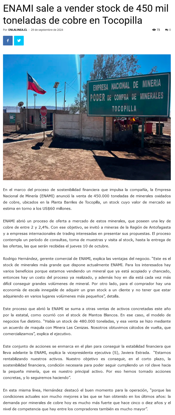 ENAMI vende 450 mil toneladas de stock de minerales en Tocopilla - (La Estrella)