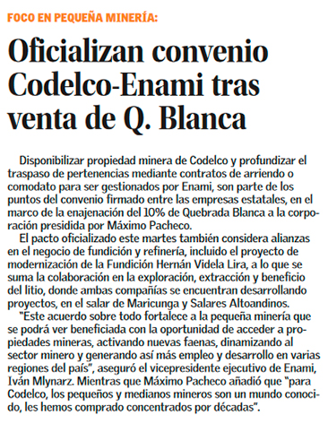 Convenio entre Enami y Codelco beneficiará a la pequeña minería - (El Mercurio de Antofagasta)