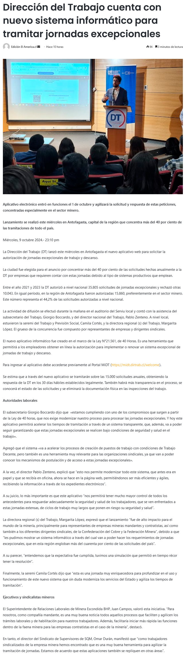 En Antofagasta fue lanzado el nuevo sistema de tramitación de jornadas excepcionales de trabajo - (madero.cl)