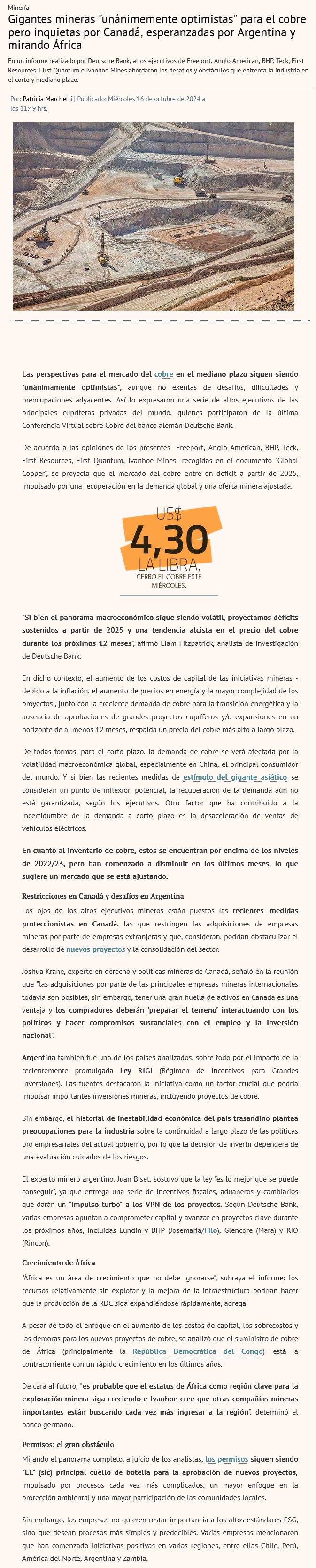 Gigantes mineras “unánimemente optimistas” por la recuperación de la demanda global por cobre y nuevos destinos de inversión - (Diario Financiero)