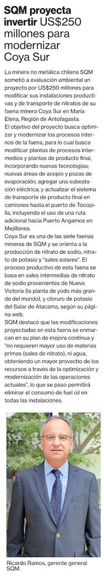 SQM realizará modificaciones por US$250 millones a faena Coya Sur - (El Mercurio de Antofagasta)
