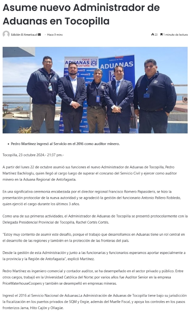 Pedro Martínez Bachiloglu asume como administrador de Aduanas de Tocopilla - (portalportuario)