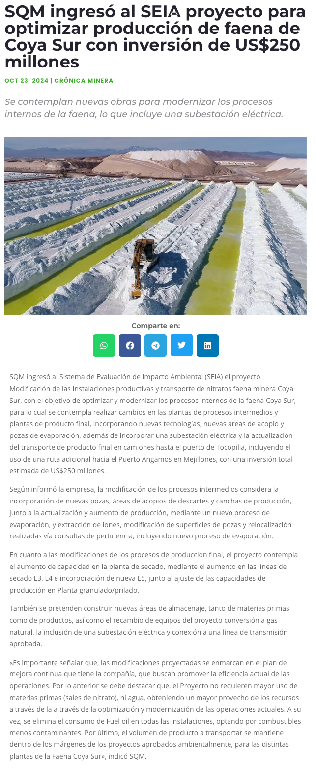 SQM ingresa al SEA proyecto que modifica y optimiza producción de faena Coya Sur con inversión de US$250 millones - (DF Online)