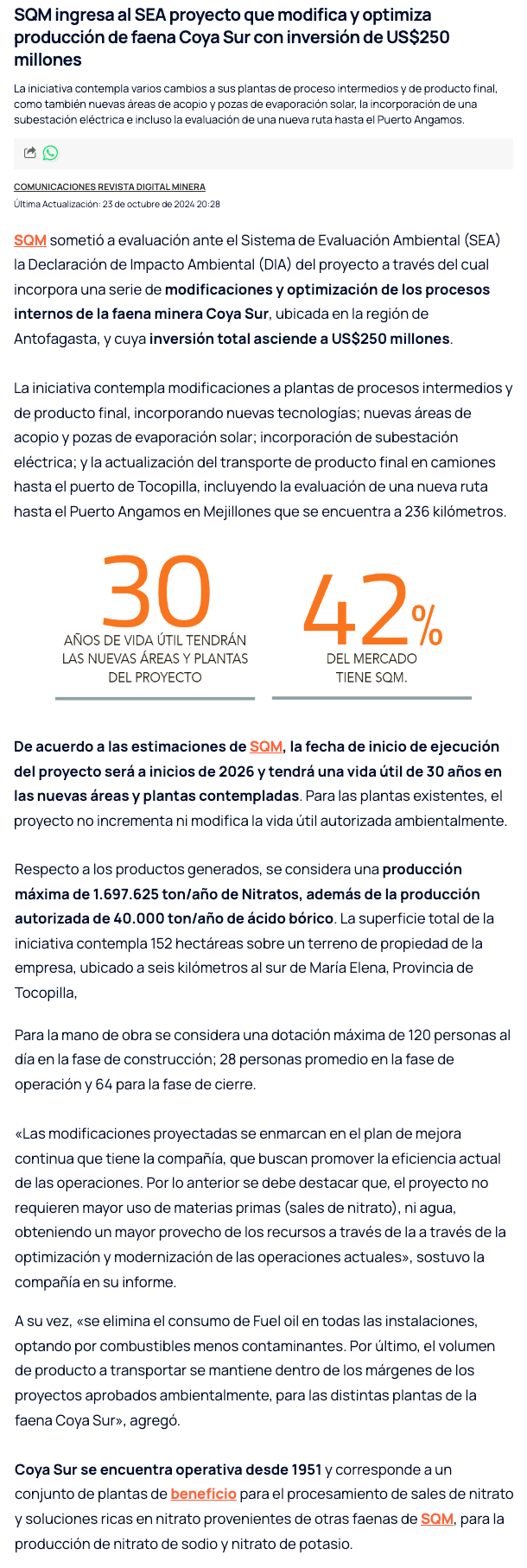 SQM ingresó al SEIA proyecto para optimizar producción de faena de Coya Sur con inversión de US$250 millones - (electromineria.cl)