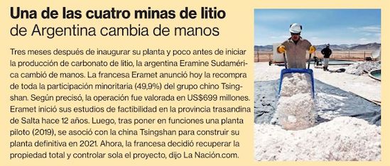 Siguen compras en mercado del litio en Argentina: Eramet controla el 100% de su negocio, tras pago de US$699 millones a Tsingshan - (Pulso)