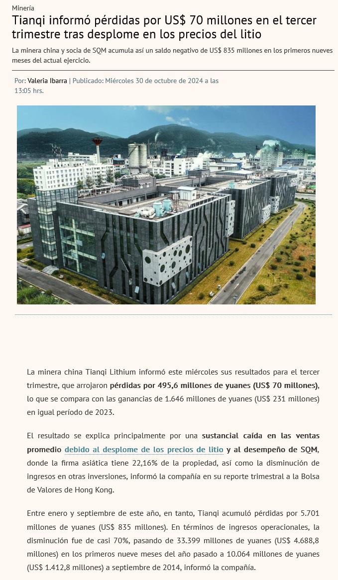 Tianqi informó pérdidas por US$ 70 millones en el tercer trimestre tras desplome en los precios del litio - (tendenciashoy.cl)