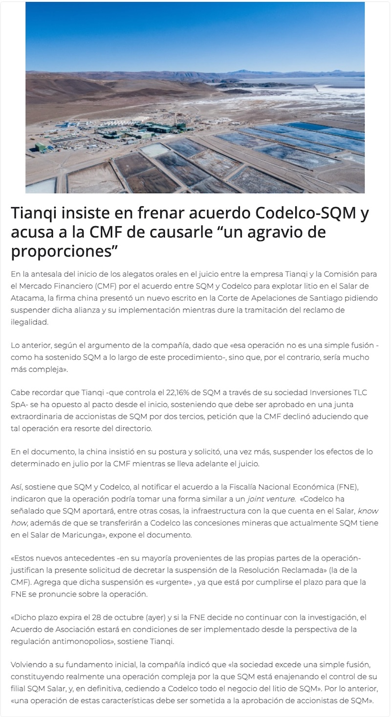 Tianqi continúa buscando suspender acuerdo entre Codelco y SQM debido a que ''afecta los derechos de los accionistas'' - (puranoticia.cl)