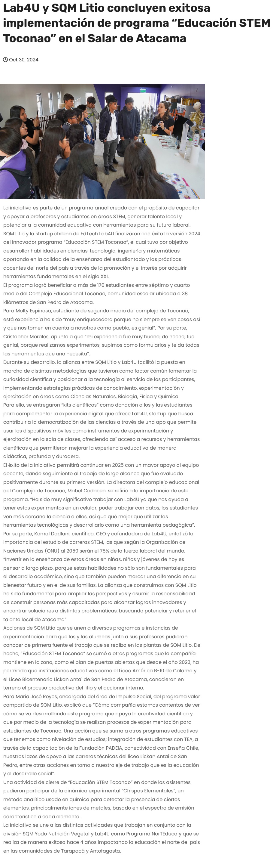 Lab4U y SQM Litio concluyen exitosa implementación de programa “Educación STEM Toconao” en el Salar de Atacama - (enlalinea)