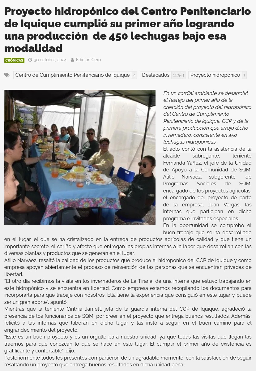 Proyecto hidropónico del Centro de Cumplimiento Penitenciario cumple primer año de existencia - (El Longino de Iquique)