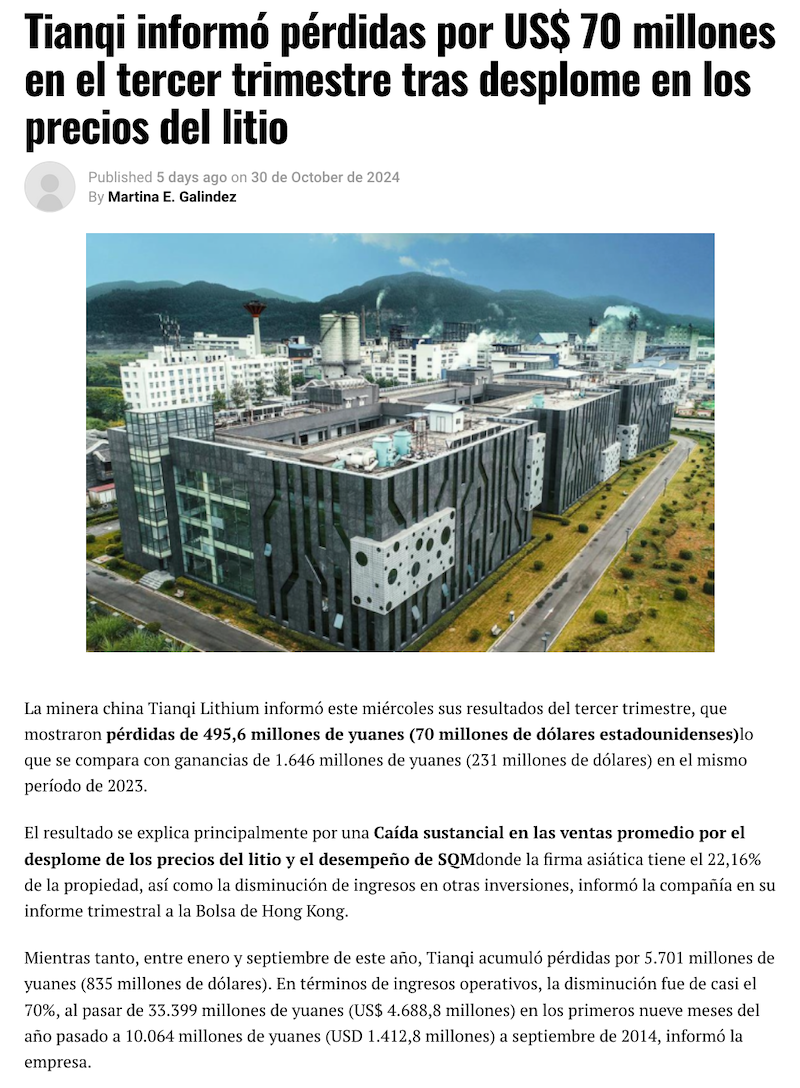 Tianqi informó pérdidas por US$ 70 millones en el tercer trimestre tras desplome en los precios del litio - (DF Online)