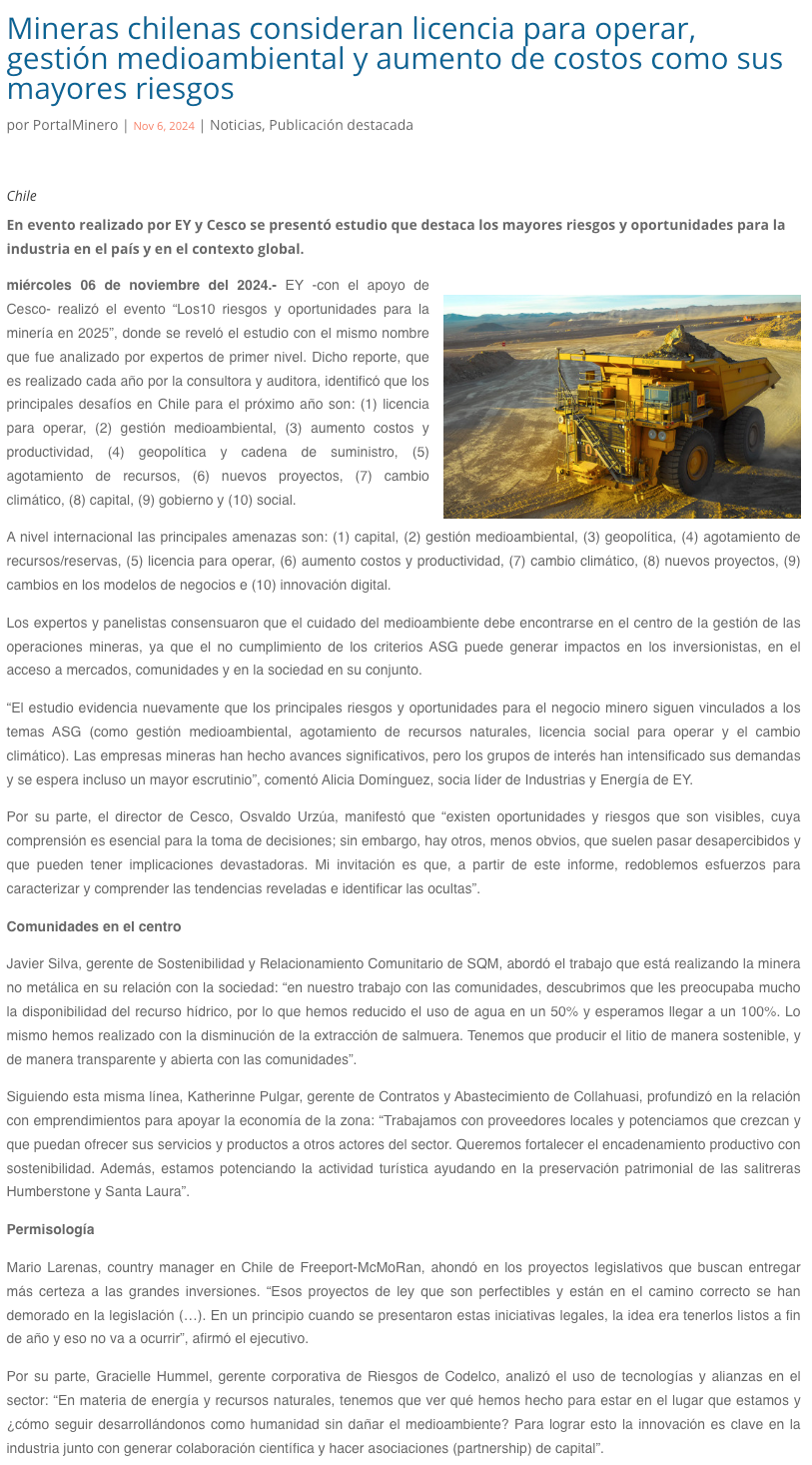Mineras chilenas consideran licencia para operar, gestión medioambiental y aumento de costos como sus mayores riesgos - (portalinnova.cl)