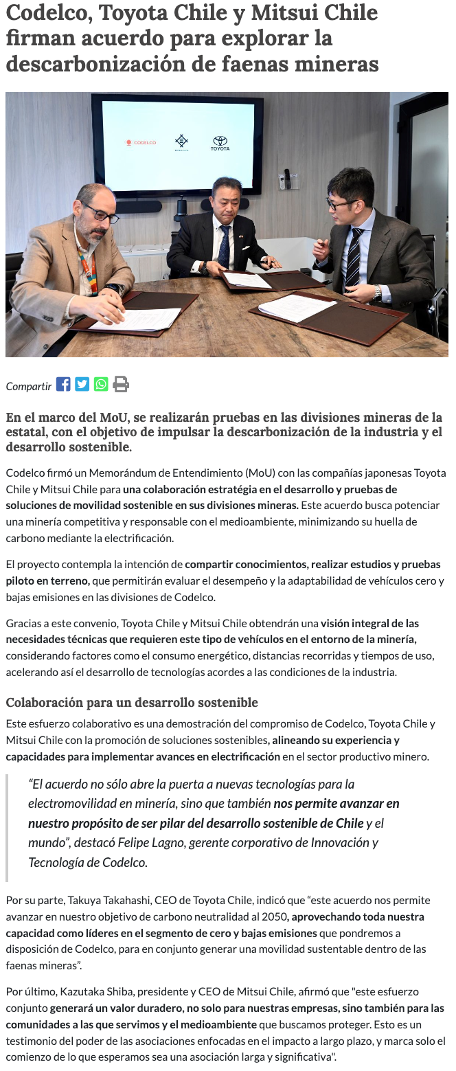 Codelco, Toyota Chile y Mitsui Chile firman acuerdo para explorar la descarbonización de faenas mineras - (mch.cl)