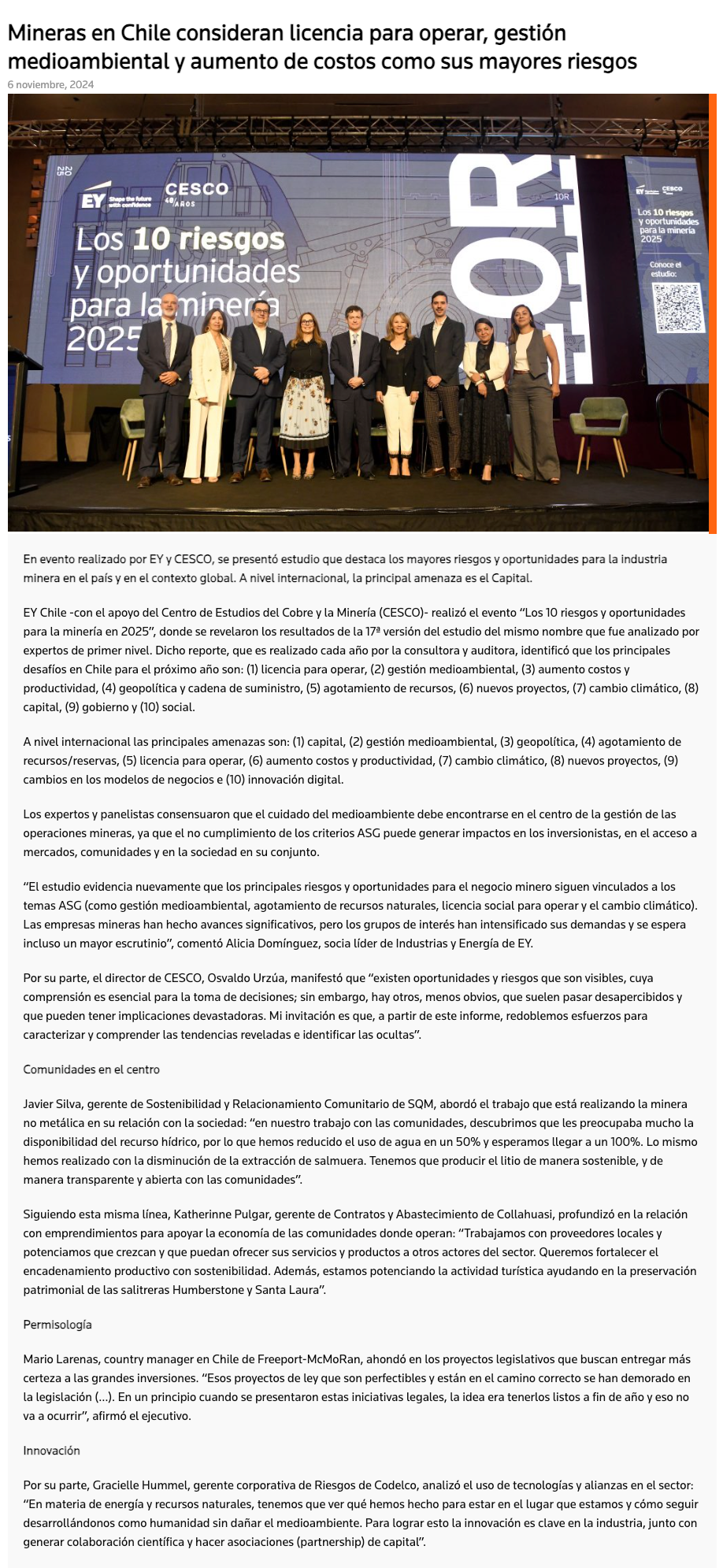Mineras chilenas consideran licencia para operar, gestión medioambiental y aumento de costos como sus mayores riesgos - (portalinnova.cl)