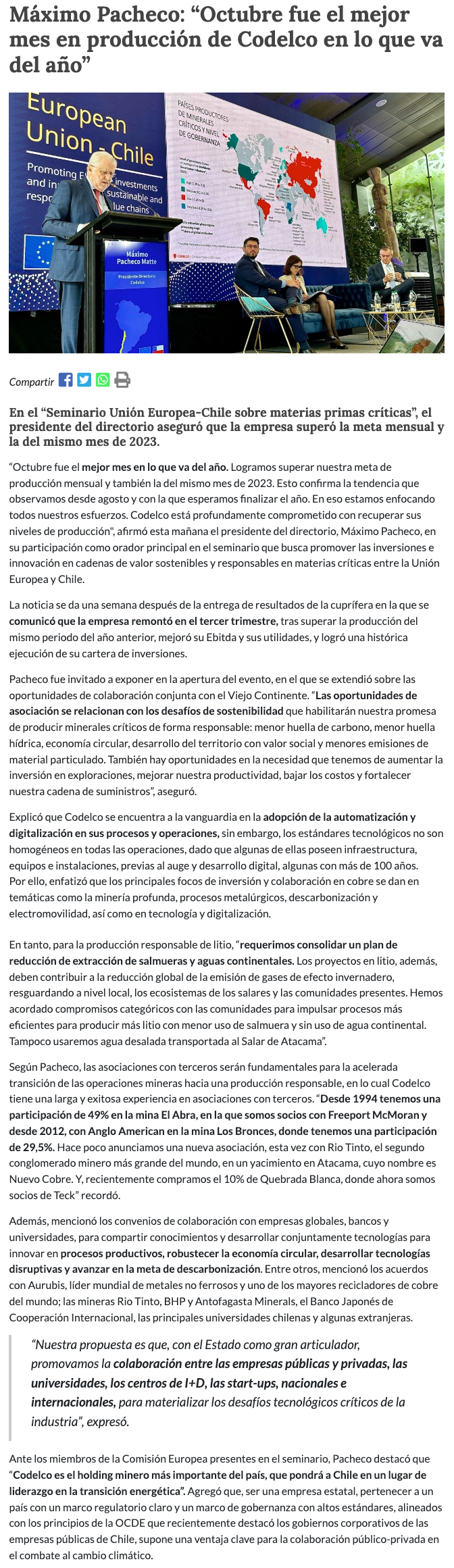 Pacheco destaca la producción de octubre como la mejor del año - (El Mercurio de Antofagasta)