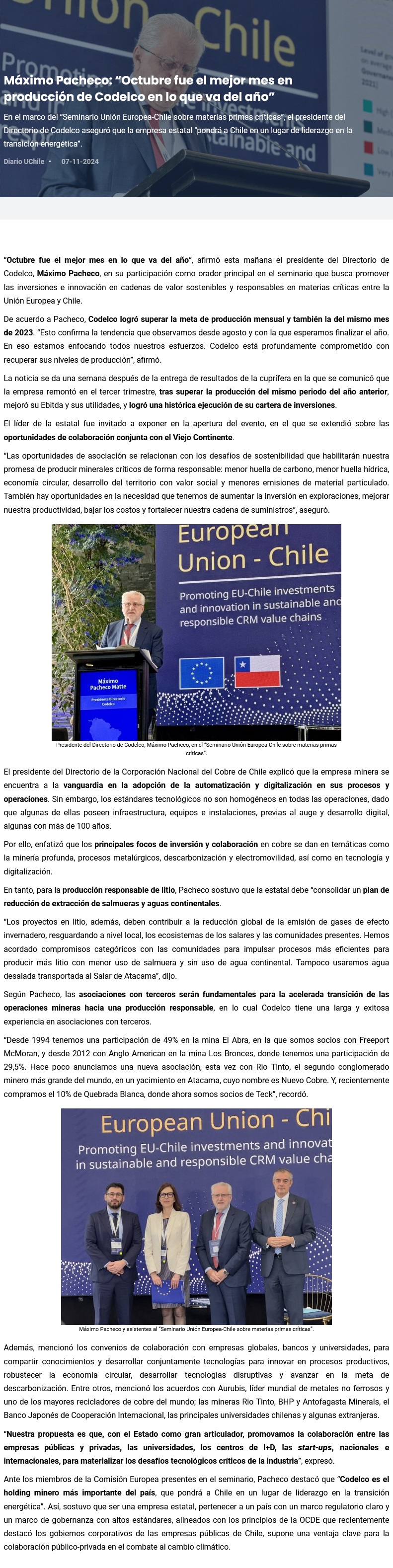 Pacheco destaca la producción de octubre como la mejor del año - (El Mercurio de Antofagasta)