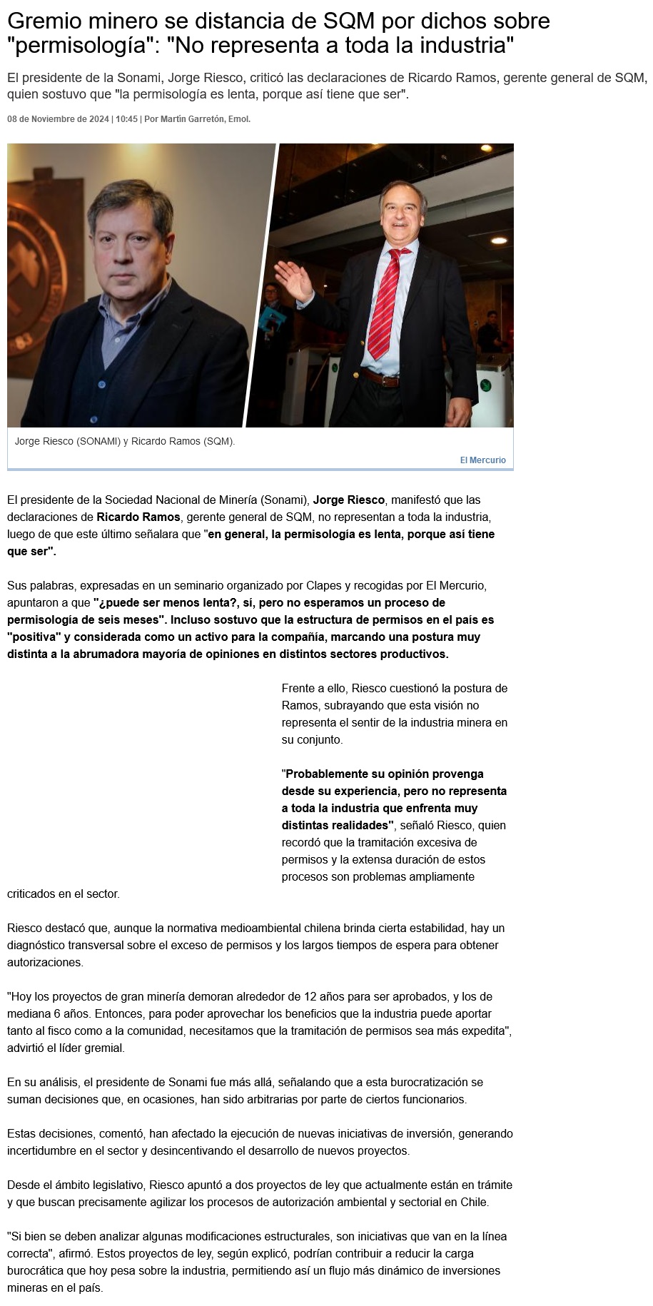 Gremio minero se distancia de SQM por dichos sobre "permisología": "No representa a toda la industria" - (El Chañarcillo)