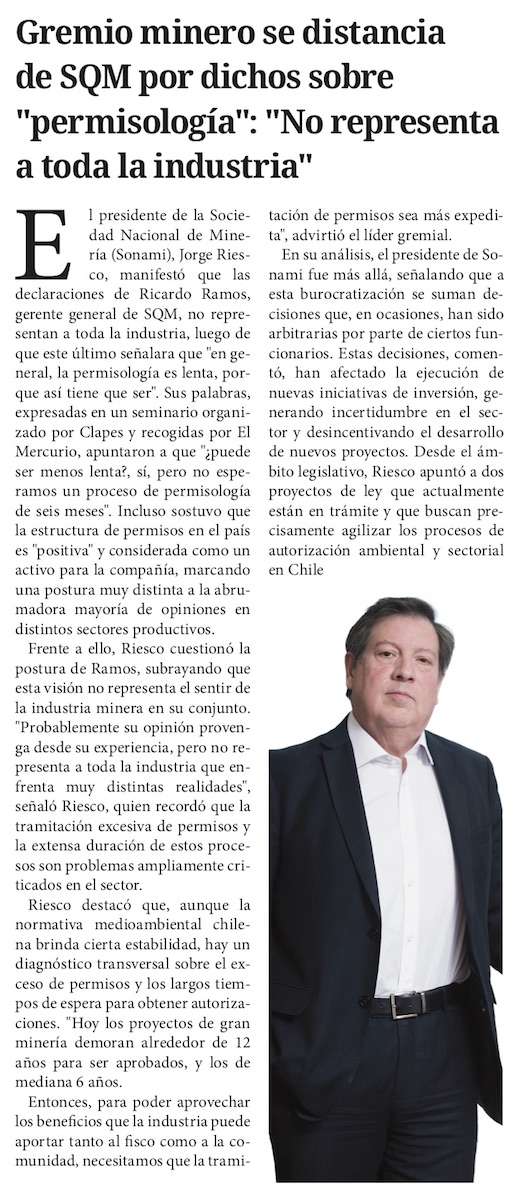 Gremio minero se distancia de SQM por dichos sobre "permisología": "No representa a toda la industria" - (emol)